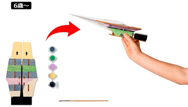発射台を好きなカラーに塗って、紙飛行機を設置して飛ばす!風向きや角度、本体の形で飛距離が変化