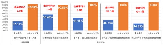 2024年9月FP2級学科試験におけるFPキャンプ受講生の合格率は92.9%※3で、全体の合格率32.5%※4の2.9倍を記録しました。FPキャンプ受講生が受検した4つの実技試験では、日本FP協会 資産設計提案業務の合格率が90.6%※5と全体平均の1.6倍、きんざいの3種類(個人資産相談業務・生保顧客相談業務・中小事業主資産相談業務)はすべて受検者が全員合格する合格率100%※5を達成しました。