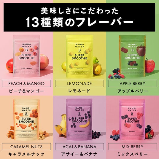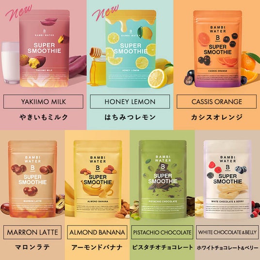 『BAMBI WATER スーパースムージー』は、スーパーフードと205種類の酵素やビタミン、ミネラルを凝縮した最新のスムージーです。レアシュガーを使用しているので甘くて美味しいのに太りにくく低カロリー。野菜不足の方や体調・健康管理をしたい方はもちろん2種類の食物繊維が満腹感を演出してくれるので置き換えダイエットとしてもおすすめです。今回「はちみつレモン味」と「やきいもミルク味」の2種類の新フレーバーが加わり、全13種類のフレーバーの展開となります。種類豊富なラインナップを取り揃えており、飲み飽きず毎日の生活に継続して取り入れていただくことができます。