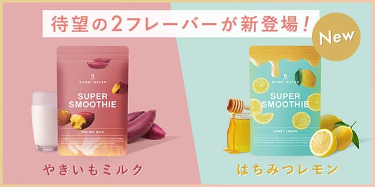 「自分らしく、理想の自分を叶える」をコンセプトとするトータルボディメイクブランド「BAMBI WATER(バンビウォーター)」を展開する株式会社ラングレー(本社:東京都渋谷区、代表取締役:栗原 淳徳)は、『BAMBI WATER スーパースムージー』から新フレーバーとなる「はちみつレモン味」「やきいもミルク味」の2フレーバーを2024年3月27日(水)から発売します。