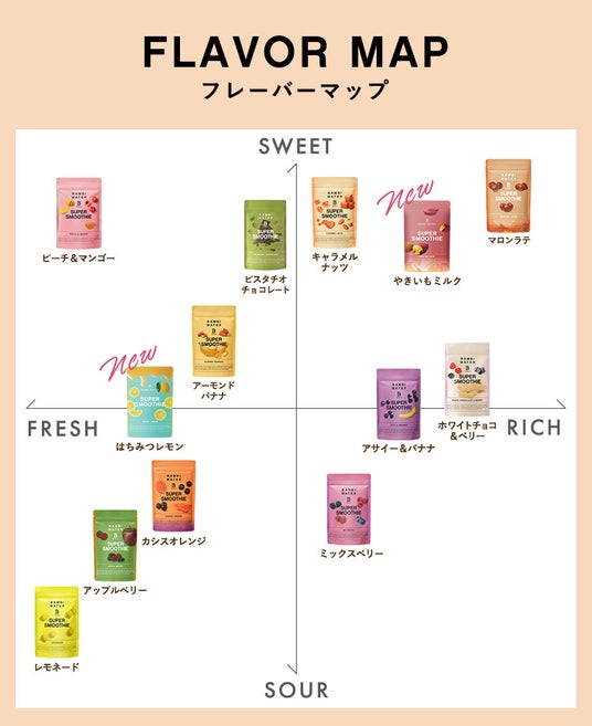 バンビウォータースタッフが作成したフレーバーマップを用意しています。全13種類のスムージーの中から自分好みのフレーバー選びの参考にご利用ください。
