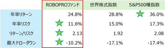 ※ROBORPOファンド:分配金再投資基準価額、世界株式指数:MSCI ACWI Gross Total Return USD Index(円換算)、S&P500種指数:トータルリターン(円換算ベース)