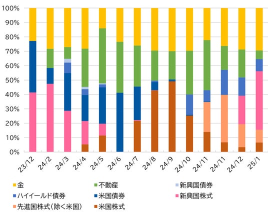 右図はROBOPROファンド設定(2023年12月)以降の月次リバランスおよび臨時リバランス時における投資対象資産の組入比率の推移です(2023年12月データは設定時、初回リバランスは2024年2月)。