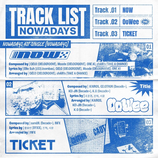 公開されたトラックリストによると、NOWADAYSのデビューシングルには、「OoWee」を始め「NOW」、「TICKET」まで計3つのトラックが収録されている。