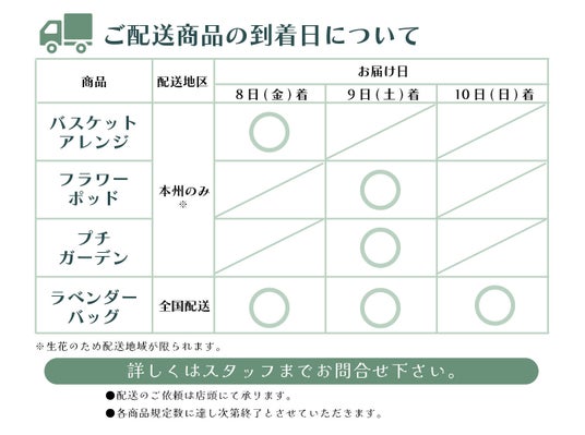 ※バスケットアレンジ・フラワーポット・プチガーデンは生花のため配送地域が限られます。詳しくはスタッフまでお問合せください。