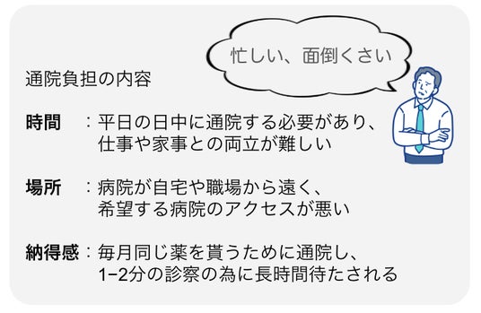 生活習慣病は初期段階では自覚症状がほとんどない為、自己保健意識が上がりにくい傾向にあります。それに加え、通院負担や納得感が低い場合に健康診断後の受診率の改善に限界が出てきてしまいます。「早期治療開始」「治療継続」はこれまで多くの企業人事部門を悩ませてきました。