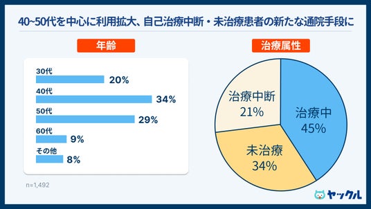 ヤックルのオンライン保険診療は18−22時の終業後のタイミングで手軽に医療機関の受診が可能なため、40~50代を中心に全国から未治療や治療自己中断患者が、受診患者全体の55%以上を占める実績があります。