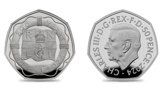 設立から200年を迎える2024年、50ペンス記念コインには、RNLIの旗と浮き輪などのデザインが採用されました。