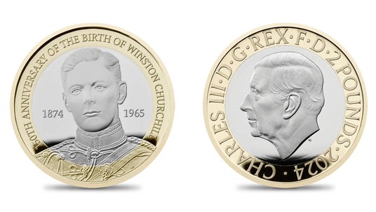 アニュアルセットの2ポンドコインには、イギリスの近代史を支えた政治家、ウィンストン・チャーチルの生誕150周年を記念し、彼の若かりし頃の肖像が描かれています。
