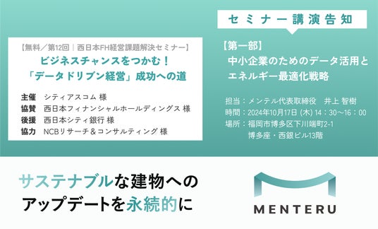 本イベント(主催:株式会社シティアスコム、協賛:株式会社西日本フィナンシャルホールディングス)は「データドリブン経営」を目指す経営者・システム担当者向けに行われるイベントです。井上のパートでは「中小企業のためのデータ活用とエネルギー最適化戦略」について詳しく語ります。イベントの詳細は〈 https://www.nnfh.co.jp/assets/pdf/news/nnfh_240820-1.pdf 〉でご確認いただけます。