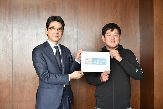 岩手日報社とスポンサー契約を締結した米澤蓮選手。写真左は川村公司社長