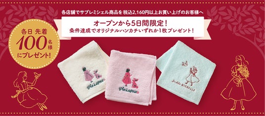 オープン記念として最初の5日間限定で、下記の条件達成のお客様に『サブレミシェル』『パイラフール』のオリジナルタオルハンカチをいずれか1枚プレゼントいたします。