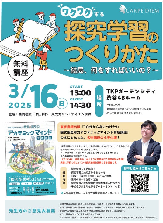 現役東大生を中心に、教育支援事業等を行う株式会社カルペ・ディエム(代表者:西岡壱誠所在地:東京都中央区)では、小学校の先生方を中心に、教員の皆様を対象に「ワクワクする探究学習のつくりかた」をテーマにイベントを開催いたします。
