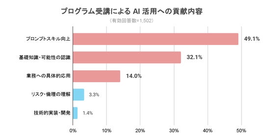 日本リスキリングコンソーシアムが提供している生成AI関連プログラムで学んだ内容が、AI活用においてどのように役立ったかを聞いたところ、「プロンプトスキル向上」が49.1%と最も多く、次いで「基礎知識・可能性の認識」が32.1%、「業務への具体的応用」が14.0%となりました。