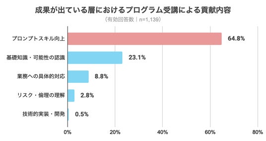 なお、生成AIツールを活用することで「成果が出ている」と回答した層においては、64.8%が「プロンプトスキル向上」を挙げました。