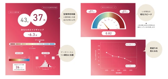 現在の老化進行度(エイジギャップ)や老化スピード(1年の間に何歳分の歳をとっているか)を把握できます。