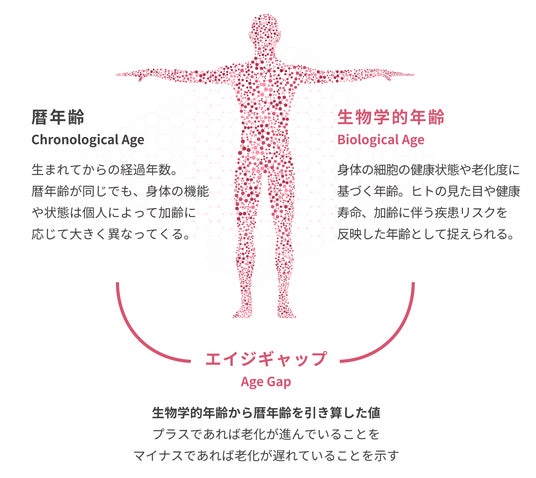 エピクロック(R)テストは、世界でスタンダードとなりつつある、エピジェネティクスの情報から身体の老化具合や老化の進行速度を「見える化」する次世代の生物学的年齢検査です。生物学的年齢は「暦年齢(誕生からの経過年数)」と異なり、見た目の若々しさや健康寿命、加齢に伴う疾患リスクを反映した年齢として捉えられています。