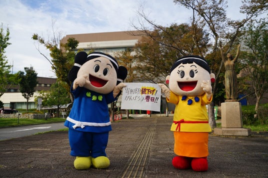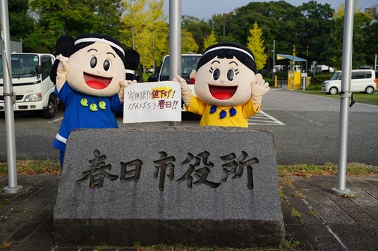 春日市の公式マスコットキャラクター「かすがくん(左)」と「あすかちゃん(右)」。市役所前で寄付額の値下げをPR。