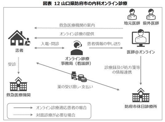 『コロナ後の平時においては山口県防府市や千葉県野田市などにおいて特定の診療科、時間、曜日、地域における初期救急体制の補完を目的として自治体でオンライン診療が導入されている。