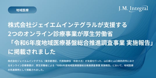 株式会社ジェイエムインテグラル(東京都港区、代表取締役:和泉大志)が支援を行った、山口県と山口県防府市におけるオンライン診療事業が、厚生労働省による「令和6年度地域医療基盤総合推進調査事業 実施報告」において、地域医療の先進事例として掲載されました。 ▶︎ 詳細:厚生労働省「救急医療機関受診の適正化に向けた、軽症の急性疾患等に 対応するための遠隔医療等の活用に関する調査研究 報告書」(https://www.mhlw.go.jp/content/001482538.pdf)