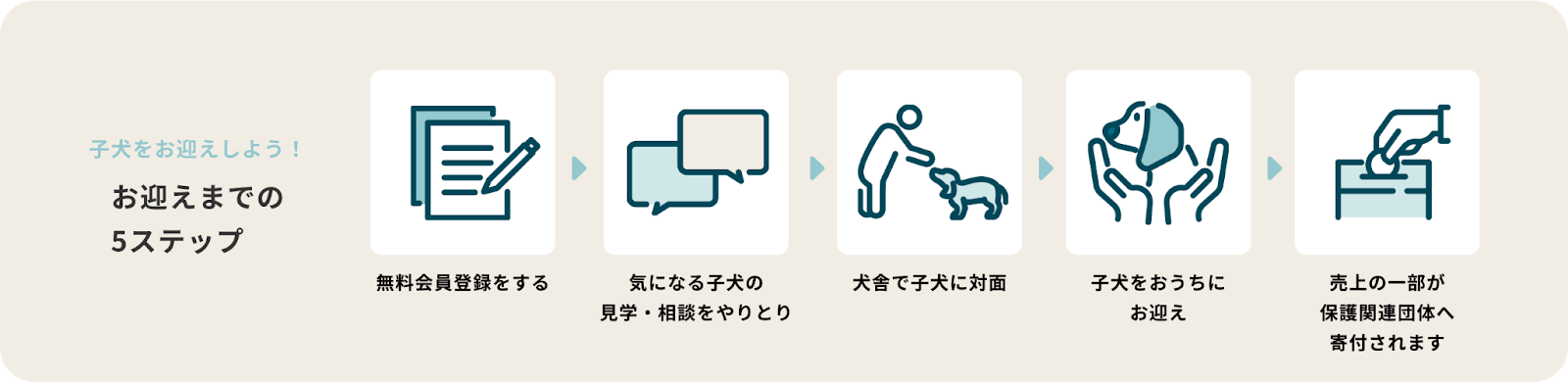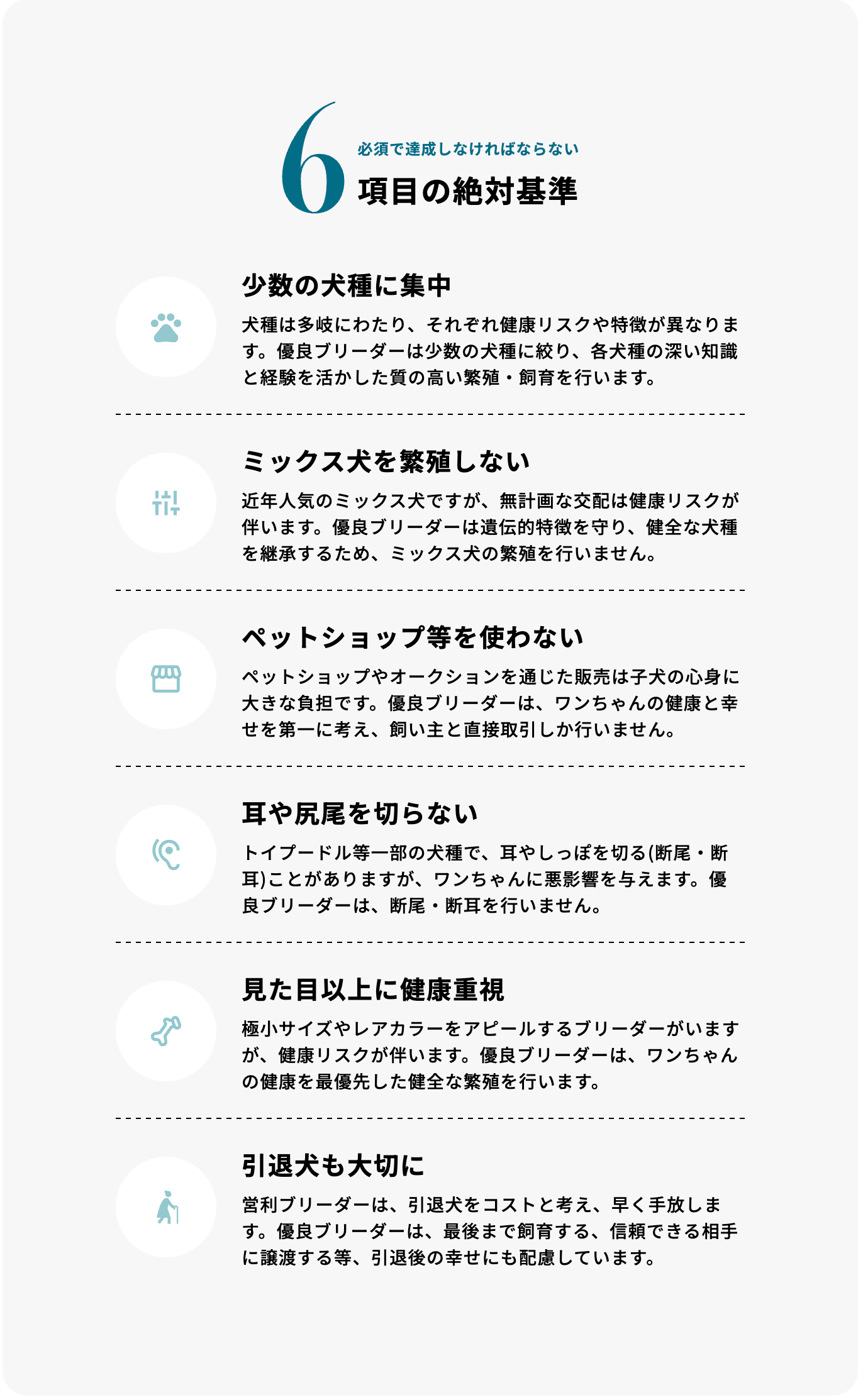 私たちは、動物福祉の観点に立った「厳しい審査基準」と「透明性ある情報提供」で、飼い主と本当にワンちゃんを大切にするブリーダーをつなぎます。将来的には、この基準を業界全体に広げ、ワンちゃんに優しいブリーダーが当たり前に選ばれる世の中をつくることを目指しています。