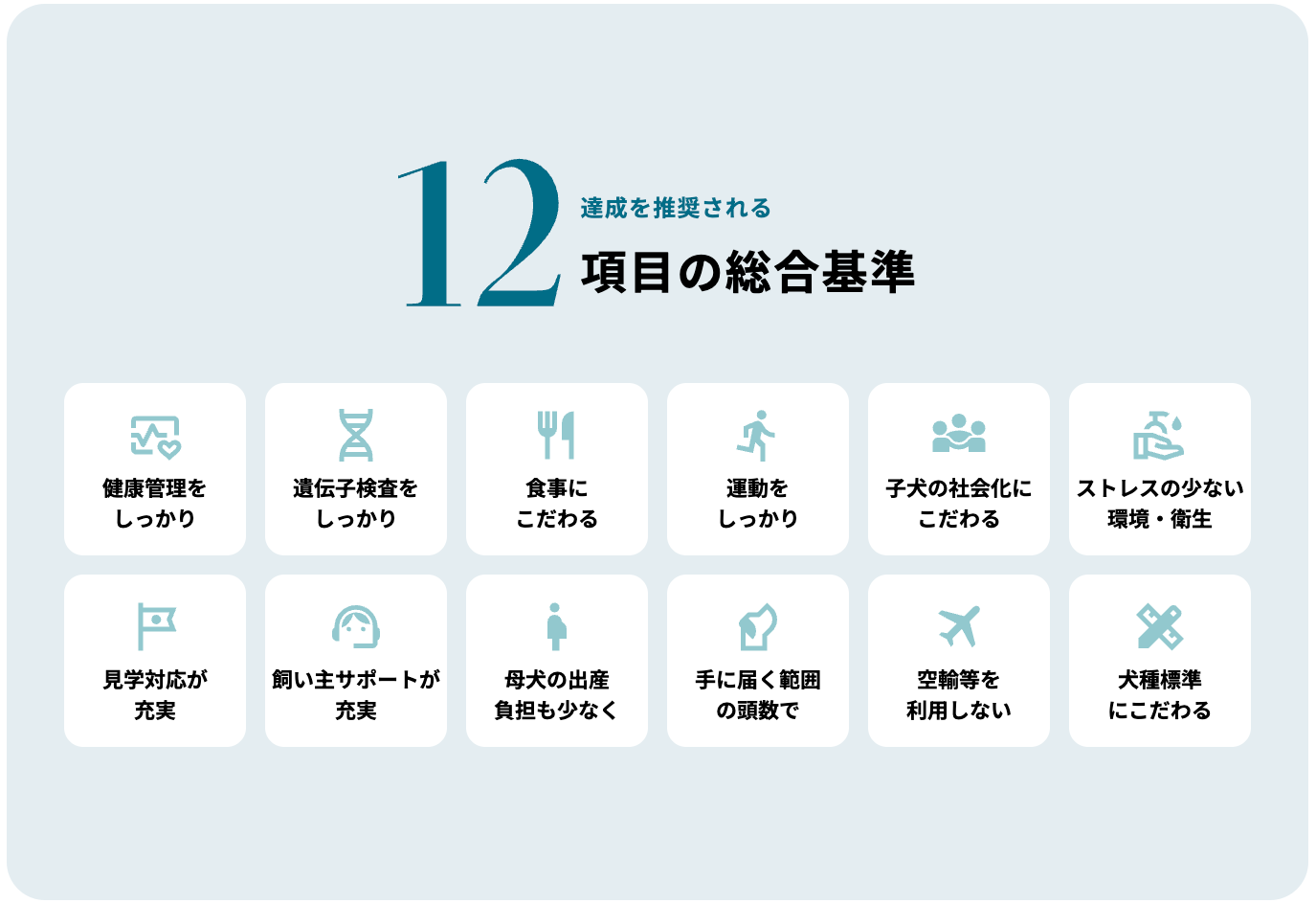遺伝リスクを抑えた繁殖、劣悪な環境の排除、断尾・断耳の不実施など、アニマルウェルフェアを徹底。合格率10%未満という厳しい基準をクリアした優良ブリーダーのみを厳選しています。