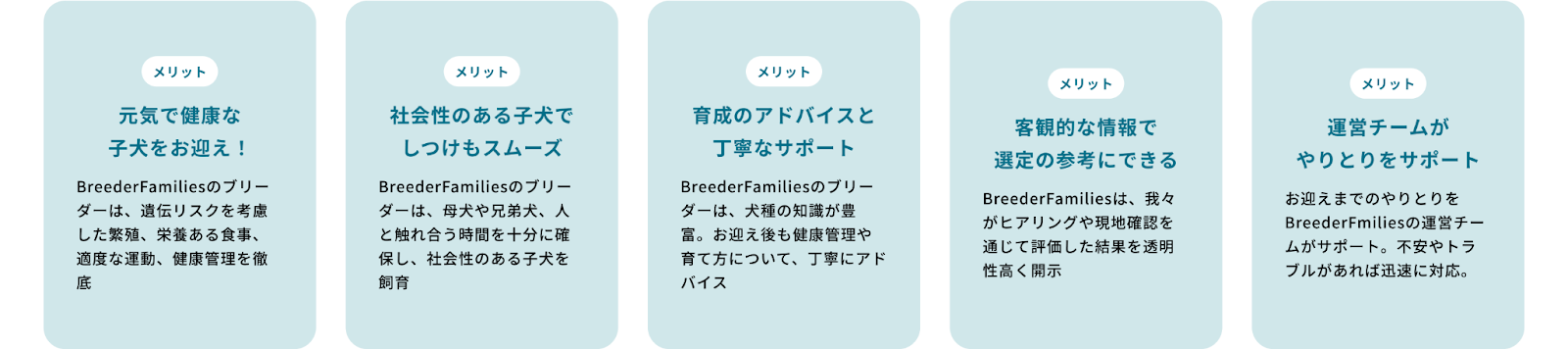 BreederFamiliesを通じて、こうした繁殖・販売を行うブリーダーが正しく評価され、世の中に広がっていくことで、ワンちゃんを取り巻く流通のあり方そのものが変わっていくと信じています。