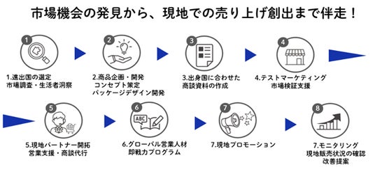 市場調査から商品企画、販路開拓、プロモーション、営業支援、人財育成まで、海外進出の全プロセスを伴走します。従来のように調査会社やコンサルティング会社などで支援が分断される情報ロスを防ぎ、実行フェーズまで責任を持ってサポートします。