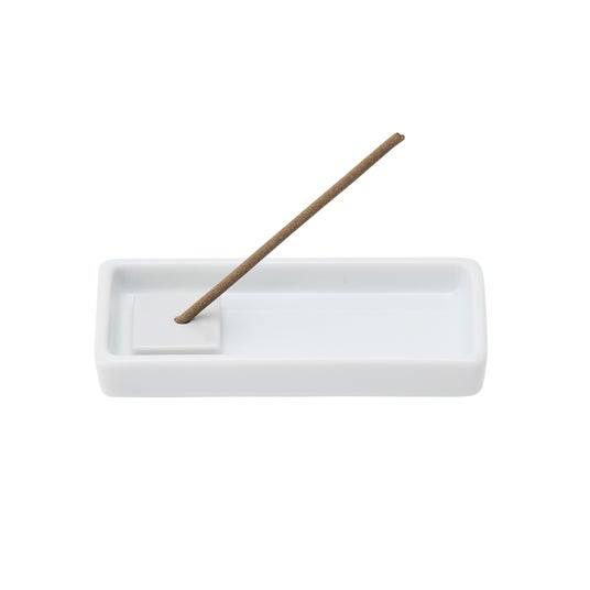 スティックタイプのお香用のホルダーもご用意しました。長方形のスリムな形状でスペースをとらず、インテリアに馴染むシンプルな白磁素材。約8cmのマークスアンドウェブの「ハーバル インセンススティック」がバランスよく収まるサイズです。陶磁器の産地として知られる愛知県瀬戸市で、職人が一つひとつ丁寧に仕上げているため、どこか温かみのある風合いも特長です。