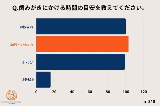 猫の歯みがきにおいては、長時間無理に続けるよりも、短時間でも猫が嫌がらない範囲で継続することが重要です。今回の結果から、多くの飼い主が短時間でのケアを実践していることが分かりますが、次項で述べる「嫌がる」「やり方が不安」といった課題が背景にある可能性もうかがえます。