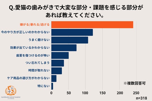 「愛猫の歯みがきで大変な部分・課題を感じる部分があれば教えてください。(複数回答可)」という質問では、「嫌がる/暴れる/逃げる」が240件で圧倒的多数を占めました。