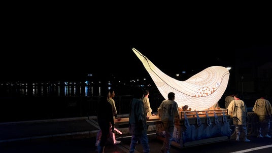 鯨の山車の奉納は、唐津出身の進藤幸彦さんが2016年に発案しました。進藤さんは祭りの実現に向けて奔走されていましたが、翌年に思い半ばで病に倒れられました。しかしその強いご遺志はご子息の進藤さわとさんに引き継がれ、実現の運びとなったものです。2022年、暗中模索の中にも多くの皆様の御支援をいただき、実現した「呼子くんち」ですが、昨年を経て今年で3回目の開催になります。