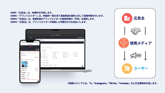STEP2:インフルエンサー様は「アフィリエイター」としてご利用いただくことができ、企業様のPR案件を弊社経由で提携アフィリエイターにご依頼させていただきます。