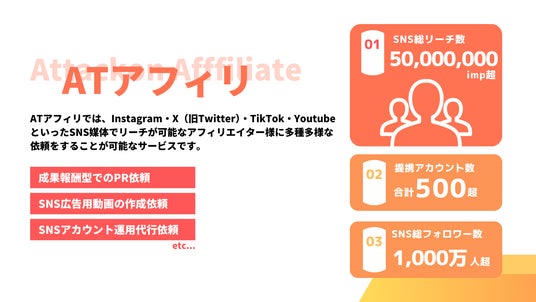 株式会社アタックオン(本社:東京都新宿区、代表取締役CEO:大前 昇太郎、以下アタックオン)が提供するSNS特化型のASP事業「ATアフィリ」は、2025年3月1日にサービス提供を開始しました。サービス開始から僅か1年で提携インフルエンサーは500メディアを突破。取引企業様も10代~20代の大学生/社会人に向けたPR施策で多くのサービスプロモーション施策にてご活用いただいております。
