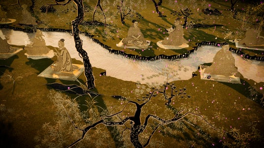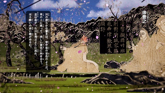 王羲之(おうぎし)が催した「曲水の宴」に集った名士たちの優雅なひとときを、3D空間に広がる自然の中に描き出しています。植物や岩、建築物は3Dモデリングによって構成され、竹林を渡る風、花の揺らぎ、陽光の移ろいといった繊細な自然表現が、絵巻の中にある“春”の気配を臨場感豊かに描き出しています。