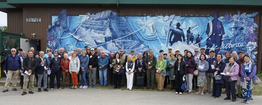 ジャスパー博物館のアルバータ初登頂をイメージした巨大壁画の前での集合写真