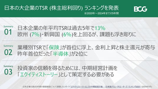 経営コンサルティングファームのボストン コンサルティング グループ(以下、BCG)は、日本企業の過去5年間の価値創造について調査したレポート「エクイティストーリーとしての中期経営計画――日本版バリュークリエーターズ・ランキング2025」(以下、レポート)を発表しました。