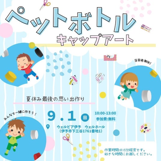 伊予市シティプロモーションサイトでは、伊予市ファンを対象に第1回いよしファンイベントを開催します。本イベントでは、ペットボトルのキャップを使ってアート作品を作るもので、親子一緒に楽しめるイベントとなっています。