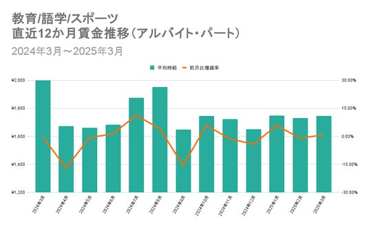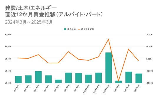 1位の「教育/語学/スポーツ」と13位の「建設/土木/エネルギー」における直近12か月の賃金推移を比較すると、「教育/語学/スポーツ」の平均時給は2024年3月から同年4月、204年8月から9月にかけて平均時給が大きく減少。受験シーズンに合わせて集中的に出稿していた特定の教育系企業の高時給求人の掲載終了が影響しました。