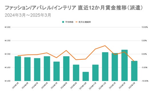 「ファッション/アパレル/インテリア」は、2024年8月から同年10月にかけて平均時給が減少傾向に。2024年11月以後は上昇傾向を見せましたが、2025年2月から3月にかけて再び平均時給が減少しました。
