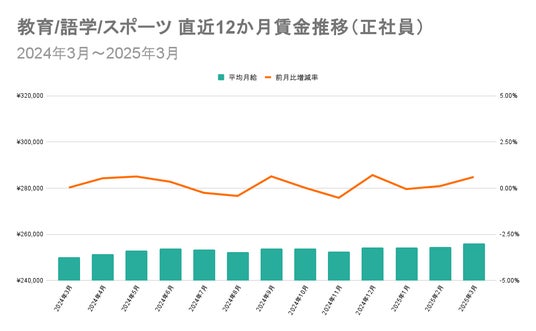 1位の「教育/語学/スポーツ」と17位の「クリエイティブ(Web系)」の直近12か月の賃金推移を比較すると、「教育/語学/スポーツ」の平均月給は2024年3月から2025年3月にかけて横ばいで推移しています。