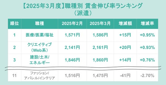 派遣の職種別伸び率ランキング(前月比)トップ3は、1位が「医療/医薬/福祉」(増加額+15円、増加率+0.95%)、2位が「クリエイティブ(Web系)」(増加額+20円、増加率+0.93%)、3位が「建設/土木/エネルギー」(増加額+14円、増加率+0.76%)でした。