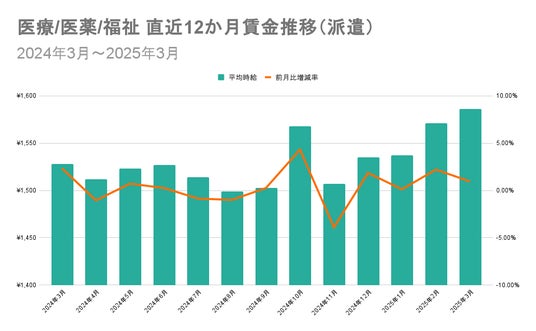 1位の「医療/医薬/福祉」と11位の「ファッション/アパレル/インテリア」における直近12か月の賃金推移を比較すると、「医療/医薬/福祉」は2024年10月に特定の派遣会社が高時給求人を複数出稿した影響で平均時給が増加。同求人の掲載終了が影響し2024年10月から11月にかけて平均時給が減少したあとは上昇傾向に入っています。