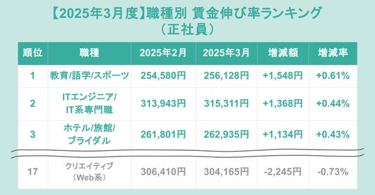 正社員の職種別伸び率ランキング(前月比)は、1位が「教育/語学/スポーツ」(増加額+1,584円、増加率+0.61%)、2位が「ITエンジニア/IT系専門職」(増加額+1,368円、増加率+0.44%)、3位が「ホテル/旅館/ブライダル」(増加額+1,134円、増加率+0.43%)でした。