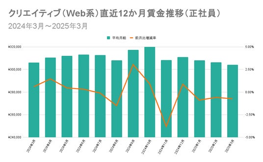 「クリエイティブ(Web系)」の平均月給は、2024年10月から同年11月にかけて特定企業の高月給求人の掲載終了が影響し減少しました。それ以後は横ばいでの推移を見せています。