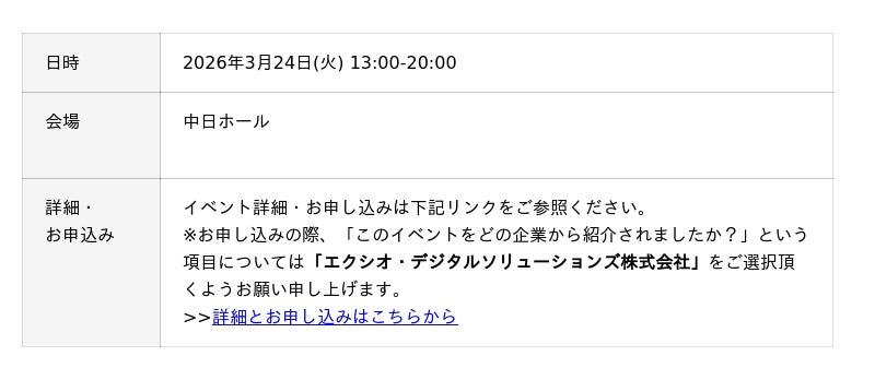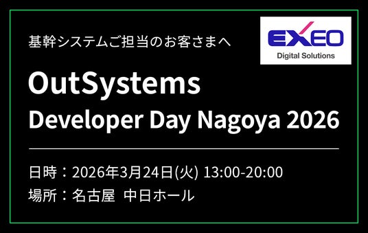 エクシオ・デジタルソリューションズ株式会社(本社:東京都港区、代表取締役社長:前田幸一、以下「当社」)は、3月24日(火)に開催されるOutSystems社主催のエンジニア向けイベント「Developer Day Nagoya 2026」にブース出展することをお知らせいたします。