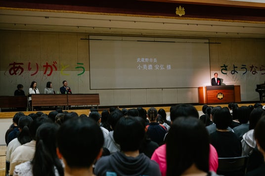 第一体育館にて全体式典を執り行いました。生徒代表の挨拶に始まり、武蔵野市の小美濃安弘市長、吉祥寺大正通り商店会副会長からもご挨拶をいただきました。その後、同窓会会長・PTA会長・校長の挨拶へと続き、校歌MVの上映や校歌斉唱を通じて、50余年にわたる校舎への感謝の想いを共有しました。会場には多くの卒業生や地域の方々も訪れ、学校と地域の絆を改めて感じる式典となりました。