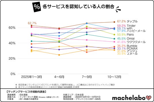 1年間の動きを見ると、『タップル』は1~3月期の62.7%から10~12月期の67.2%まで、年間を通してトップを維持しました。同様に『Tinder(ティンダー)』も約6割、『with(ウィズ)』も5割~6割と、年間を通して半数以上の人が「知っている」と回答しています。また、『Pairs(ペアーズ)』についても約5割の水準を保ちました。