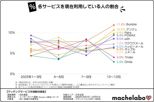 1年を通した変化を見ると、7~9月期までは多くのサービスが一桁台で推移していましたが、直近では複数のサービスが数値を上げ、混戦模様となっています。一般的に、年末にかけてはパートナー探しが活発になる傾向がありますが、その中でも『Bumble』と『アンジュ』が10%の大台に乗せたことは、今回の調査における大きな特徴といえます。