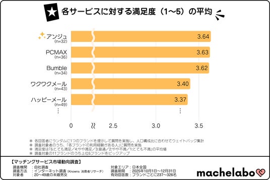 4.満足度は『アンジュ』『PCMAX』『Bumble』などが3.6を超える高評価